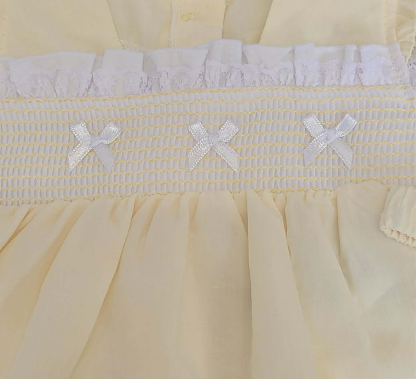 Lemon/white smocked trio bow frilly dress, pants & headband set