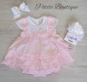 Pink/white smock dress, pants & headband set
