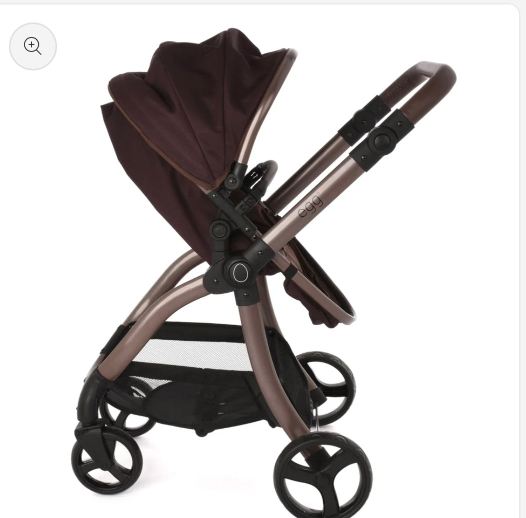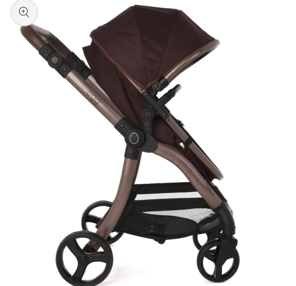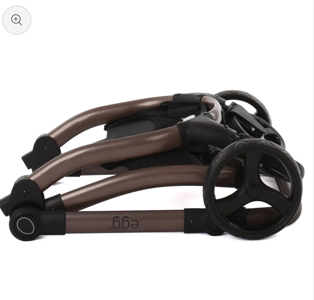 Included in the box is a coordinating apron for use in carrycot mode. The fabrics are the same stunning Mulberry colourway found on the full size egg3® stroller. Finished on a gloss chassis with cocoa leatherette hand-stitched handle bar.