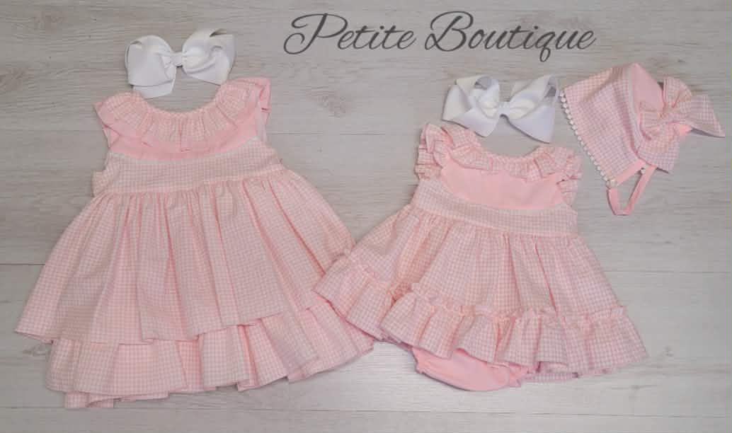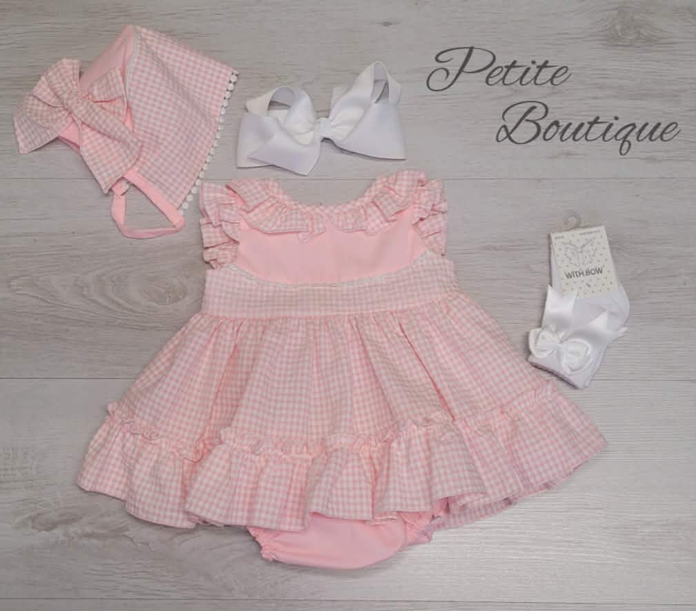 Spanish pink gingham dress, pants & bonnet